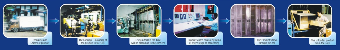 All customers' products will be loaded into galvanized/stainless steel totes (with internal dimension of 60cm x 90cm x 140cm) at the loading – unloading station, then using a forklift the totes will be placed onto the carriers. Each carrier contains two vertically positioned totes. The maximum loading capacity of the carrier is 544 kgs of product. The product carries pass through the cell at a defined cycle time with a constant conveyor speed of 7 meters per minute.